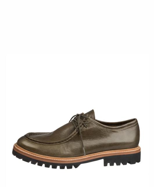Das klassische Mokassin-Design in Kaki erhält durch die dicke Profilsohle einen coolen Look. Diese robusten Lederschuhe sind aus vegetabilem Kalbsleder gefertigt und haben eine 2-Loch-Schnürung. Ihr hoher Tragekomfort und die fantastische Traktion machen sie perfekt für lange Spaziergänge im Herbst und Winter.