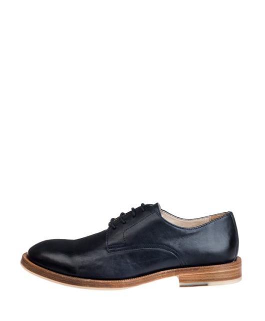 Ein zeitloser Plain Toe Derby mit abfallender Schuhspitze aus gewachstem und geöltem Kalbsleder, das in der Endverarbeitung leicht poliert wurde. Dies gibt der Oberfläche einen Glanzeffekt. Runde Schnürsenkel schnüren die 4-Loch Leiste.