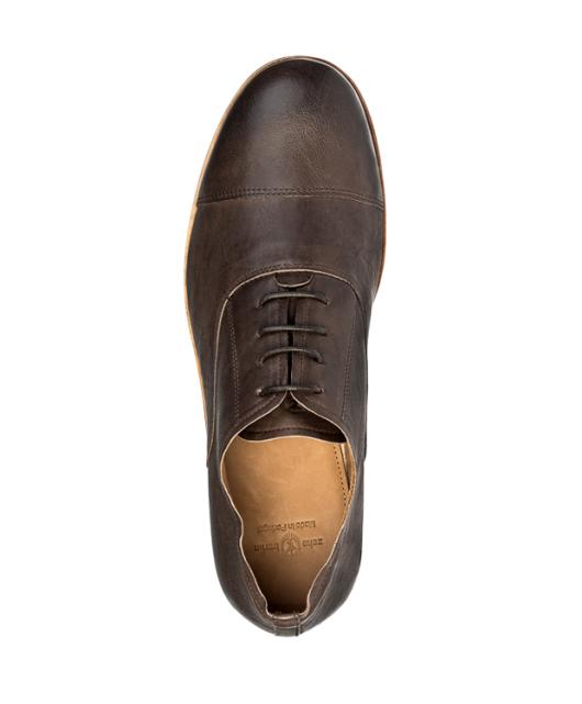Ein Zeha-Klassiker: der moderne Oxford im 20er Jahre Stil mit Frontkappe und weich geschwungenen Linien am Quartier. Er ist aus vegetabilem Känguruleder, das gewachst wurde und somit eine geschmeidige und doch griffige, seidenmatt glänzende Oberfläche bekommt, die durch das Tragen eine eigene Patina erhält. Besonders ist die natürlich belassene Lederstruktur. Runde gewachste Schnürsenkel binden die klassische 4-Loch-Schnürung.