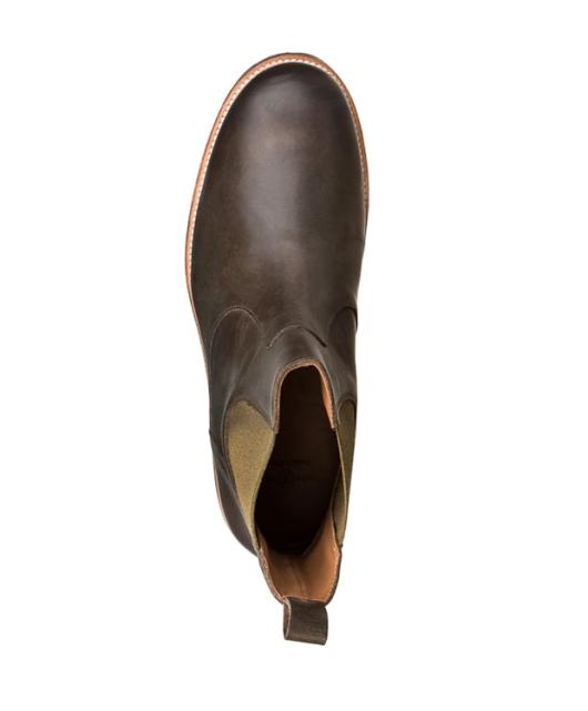 Der enganliegende Chelsea Boot hat einen typisch knöchelhohen Einstieg, der durch die elastischen Gummibandeinsätze – sein unvergleichliches Merkmal – dehnbar ist. Er ist aus grau-braunem Kalbsleder, das geölt und gewachst wurde. Durch das Tragen wird die Oberfläche matt glänzend.