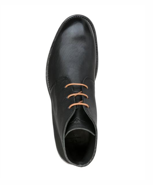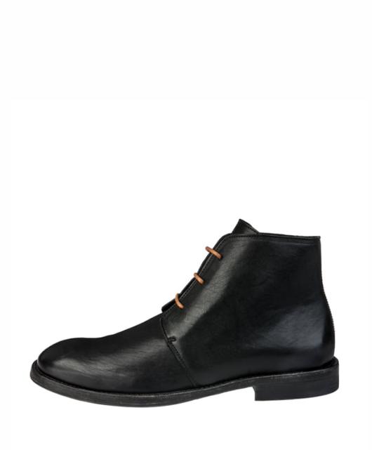 Eine klassische Plain Toe Derby Stiefelette mit flach zulaufender Frontkappe aus vegetabilem Kalbsleder, das gewachst wurde und somit eine geschmeidige und doch griffige, seidenmatt glänzende Oberfläche bekommt, welche durch das Tragen eine eigene Patina erhält. Runde Schnürsenkel schnüren die 3-Lochleiste.